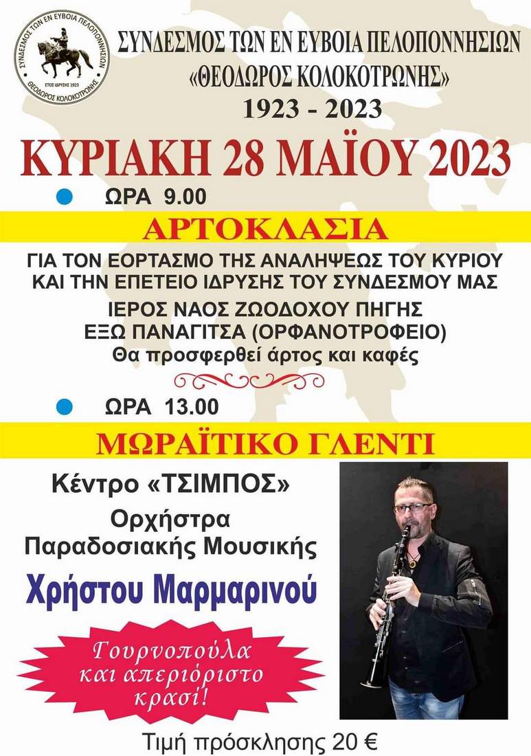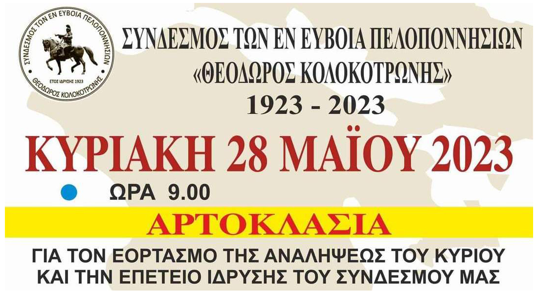 Το Διοικητικό Συμβούλιο του Συνδέσμου των Εν Ευβοία Πελοποννησίων «Θεόδωρος Κολοκοτρώνης» προσκαλεί τα μέλη και τους φίλους του Συνδέσμου στην καθιερωμένη Αρτοκλασία για τον εορτασμό της Αναλήψεως του Κυρίου και την επέτειο ίδρυσης του Συνδέσμου.