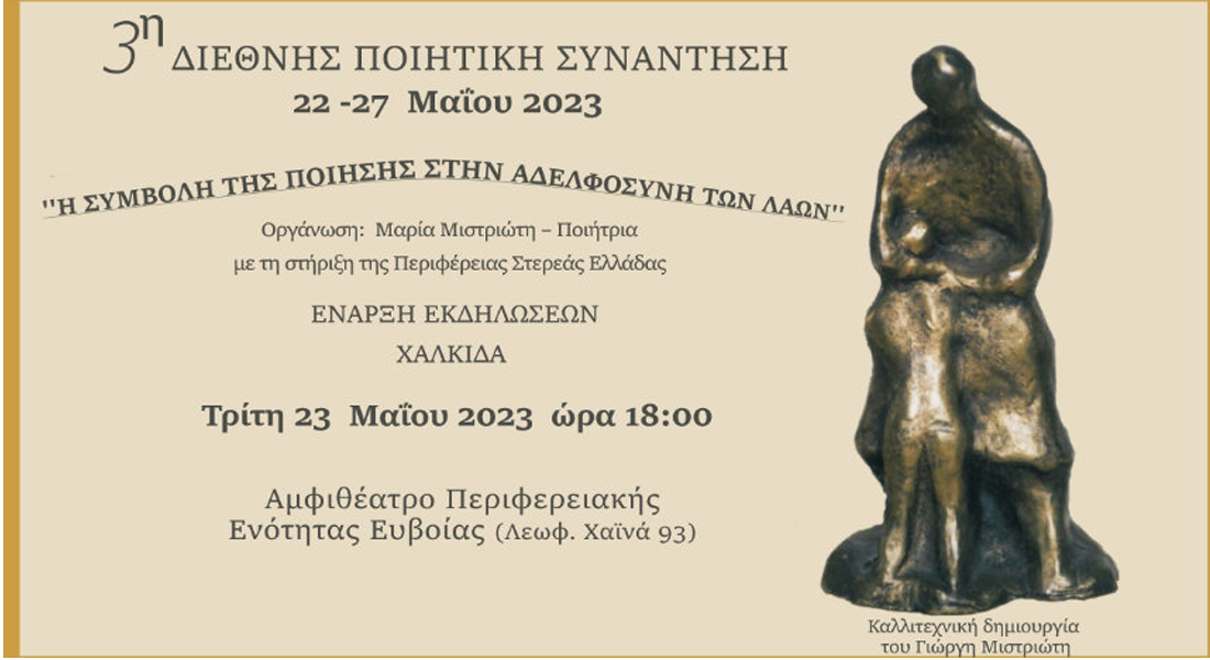Με πρωτοβουλία της Χαλκιδέας ποιήτριας Μαρίας Μιστριώτη, τακτικού μέλους της Εταιρείας Ελλήνων Λογοτεχνών, θα πραγματοποιηθεί στη Χαλκίδα, την Ερέτρια και την Αθήνα η 3η Διεθνής Ποιητική Συνάντηση, με θέμα: «Η Συμβολή της Ποίησης στην Αδελφοσύνη των Λαών».