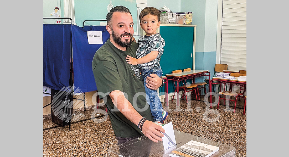 Αγκαλιά με τον γιο του Αλέξανδρο ψήφισε στο εκλογικό τμήμα του Δημοτικού Σχολείου Αμαρύνθου ο Κώστας Λυσιγάκης.