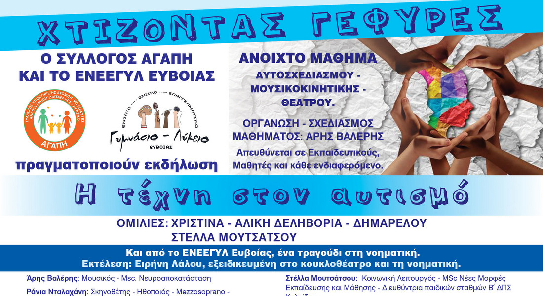 Ο Σύλλογος ΑΓΑΠΗ (Σύλλογος Υποστήριξης Ατόμων με Διάχυτες Αναπτυξιακές Διαταραχές - Αυτισμό) και το ΕΝΕΕΓΥΛ Ευβοίας διοργανώνουν μία ξεχωριστή, διαδραστική εκδήλωση με τίτλο «ΧΤΙΖΟΝΤΑΣ ΓΕΦΥΡΕΣ» την Παρασκευή 2 Ιουνίου, στις 7 το απόγευμα, στο Θέατρο Παπαδημητρίου, με ελεύθερη είσοδο.