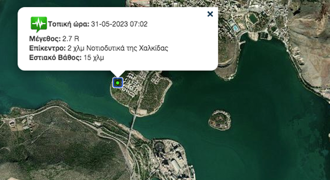 Σεισμός 2,7 βαθμών της κλίμακας Ρίχτερ σημειώθηκε στις 7:02 το πρωί της Τετάρτης 31 Μαΐου, με επίκεντρο τις Εργατικές Κατοικίες Αγίας Μαρίνας στη Χαλκίδα, δίπλα ακριβώς από την υψηλή γέφυρα.