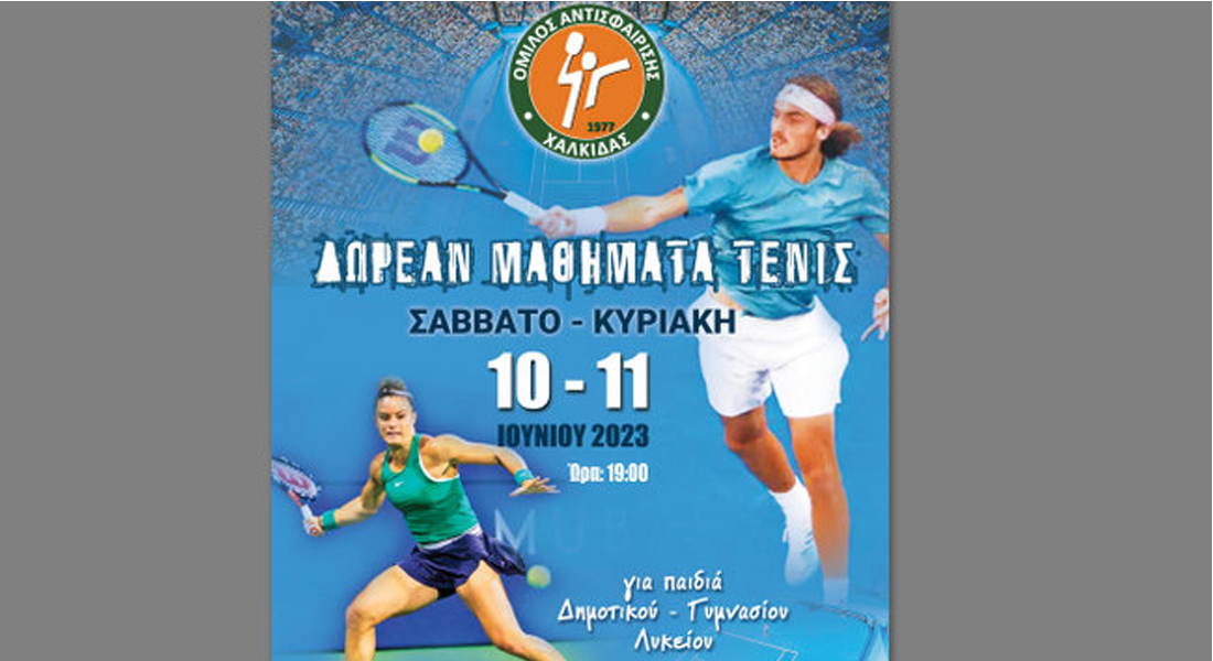 Ο Όμιλος Αντισφαίρισης Χαλκίδας (ΟΑΧ) διοργανώνει το Σαββατοκύριακο 10 και 11 Ιουνίου, στις 7 το απόγευμα, δωρεάν μαθήματα τένις για παιδιά ηλικίας 5 έως 18 ετών, ώστε να γνωρίσουν το όμορφο σπορ της αντισφαίρισης.