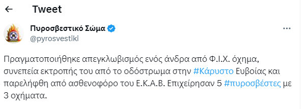 Τροχαίο ατύχημα σημειώθηκε στην Κάρυστο, το μεσημέρι της Δευτέρας 12 Ιουνίου, όταν -κάτω από αδιευκρίνιστες συνθήκες - φορτηγό ξέφυγε από την πορεία του και βγήκε από τον δρόμο.