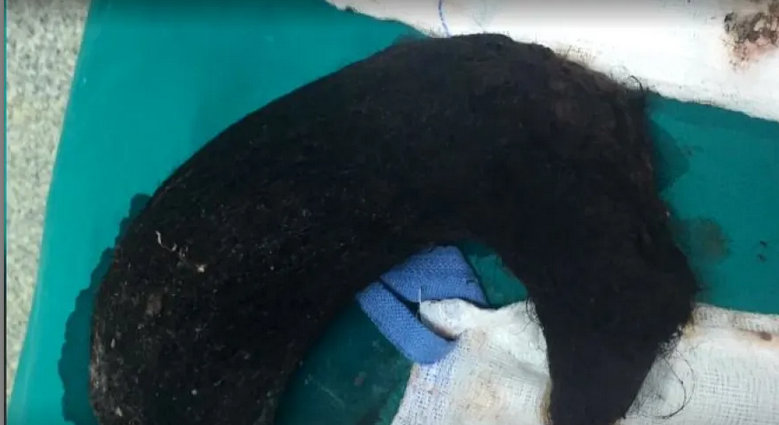 Το κορίτσι είχε πόνο στην κοιλιά και κατά την εξέτασή της η γιατρός υποψιάστηκε κάτι από μια συγκεκριμένη κίνηση που έκανε με τα μαλλιά και ζήτησε να γίνει απεικονιστικός έλεγχος, από τον οποίο φάνηκε η ύπαρξη μιας τεράστιας μάζας στο στομάχι (φωτό κάτω).