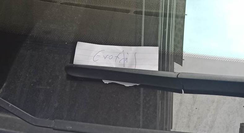 Μία ηλικιωμένη κυρία, με καροτσάκι λαϊκής, ήταν φυσικά αδύνατο να περάσει και αναγκάστηκε να κατέβει στο δρόμο, αλλά πριν προχωρήσει άφησε και ένα σημείωμα " ενοχλείς" στο παρμπρίζ.
