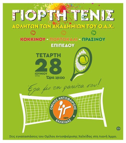 Η ετήσια καλοκαιρινή γιορτή τένις θα πραγματοποιηθεί την Τετάρτη 28 Ιουνίου, στις 7 το απόγευμα, στις εγκαταστάσεις του Ομίλου Αντισφαίρισης Χαλκίδας, στη Λιανή Άμμο.