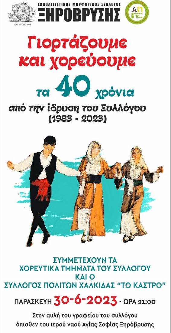 Ο Εκπολιτιστικός Μορφωτικός Σύλλογος Ξηρόβρυσης Χαλκίδας γιορτάζει τα 40 χρόνια από την ίδρυση του (1983-2023) με μια χορευτική εκδήλωση, που θα πραγματοποιηθεί την Παρασκευή 30 Ιουνίου, στις 9 το βράδυ στην αυλή του ιερού ναού της Αγίας Σοφίας, στην Ξηρόβρυση.