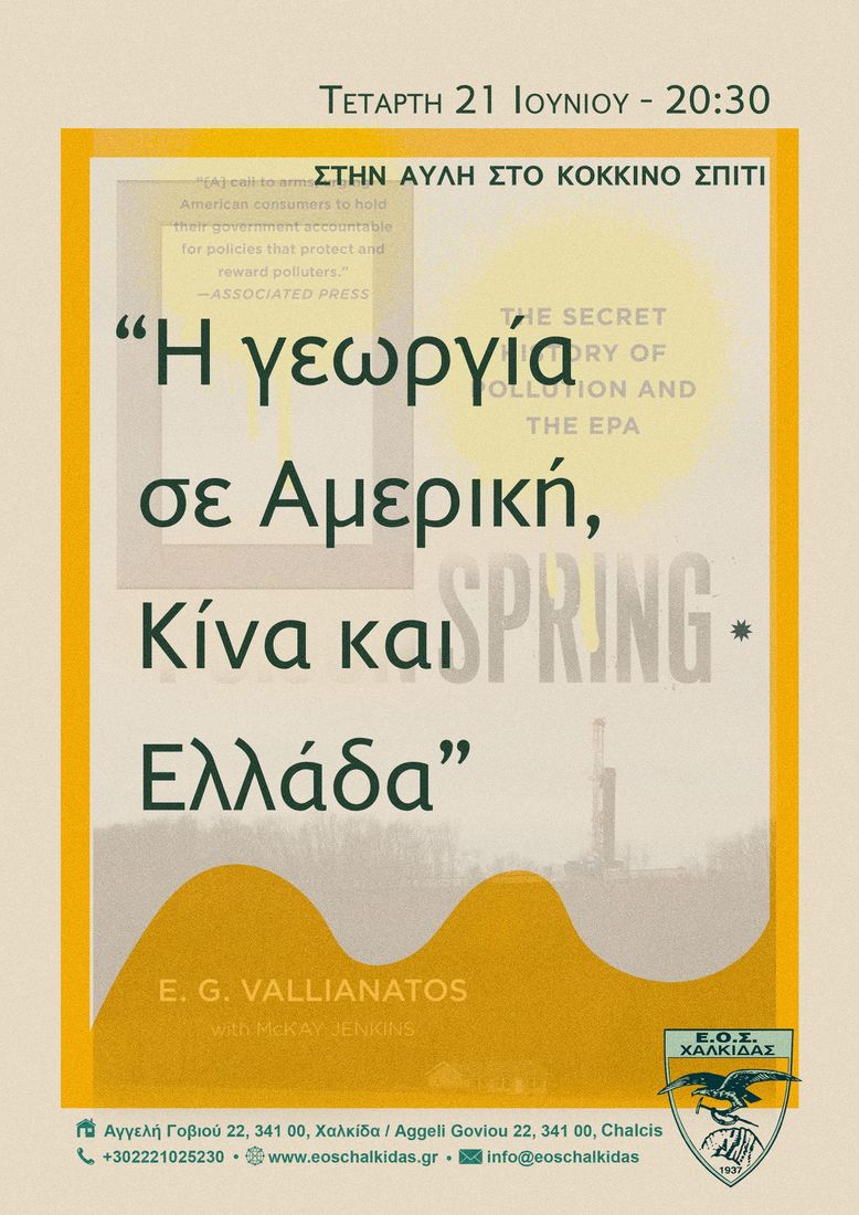 Ο Ορειβατικός Σύλλογος Χαλκίδας διοργανώνει εκδήλωση, με θέμα " Η γεωργία σε Αμερική, Κίνα και Ελλάδα", την Τετάρτη 21 Ιουνίου, στις 8:30 το βράδυ, στην αυλή του Κόκκινου Σπιτιού, στην Χαλκίδα.