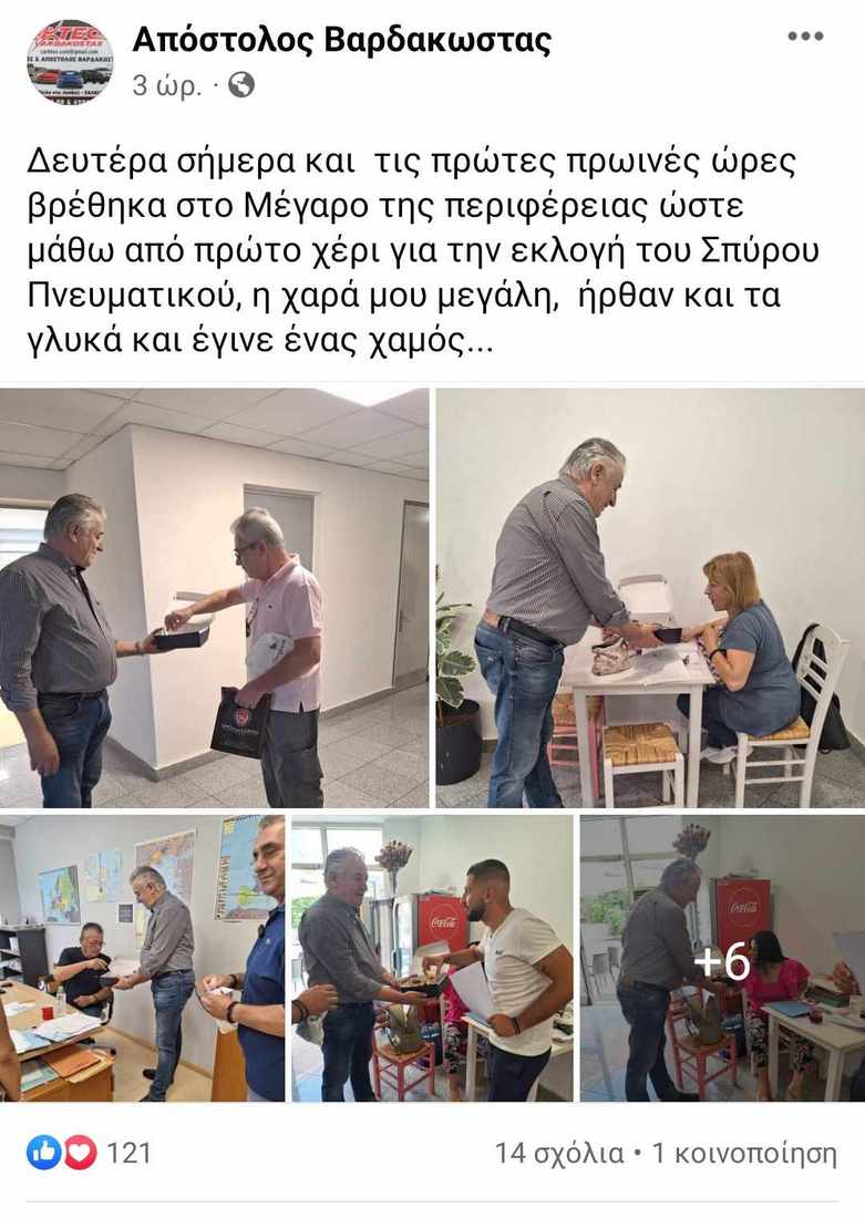 Ωστόσο, ο Απόστολος Βαρδακώστας το πρωί της Δευτέρας 26 Ιουνίου μετέβη στο Μέγαρο της Περιφερειακής Ενότητας Εύβοιας στη Χαλκίδα και μόλις ενημερώθηκε επίσημα για την εκλογή του Πνευματικού άρχισε να κερνάει όλον τον κόσμο (υπαλλήλους και πολίτες) γλυκά.