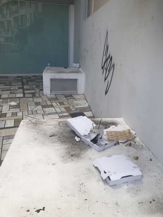 Νεαροί τρώνε πίτσες, πίνουν καφέδες και φεύγοντας αφήνουν πίσω τα σκουπίδια τους. Η φωτογραφία είναι ενδεικτική της κατάστασης και η Ελίνα Ιωάννου σημειώνει: