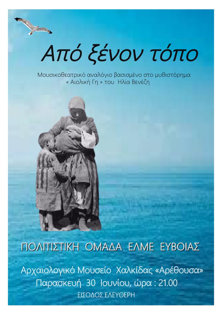 H Πολιτιστική Ομάδα της ΕΛΜΕ Εύβοιας παρουσιάζει το μουσικοθεατρικό αναλόγιο, με τίτλο "Από Ξένον Τόπο" βασισμένο στο μυθιστόρημα "Αιολική Γη" του Ηλία Βενέζη.
