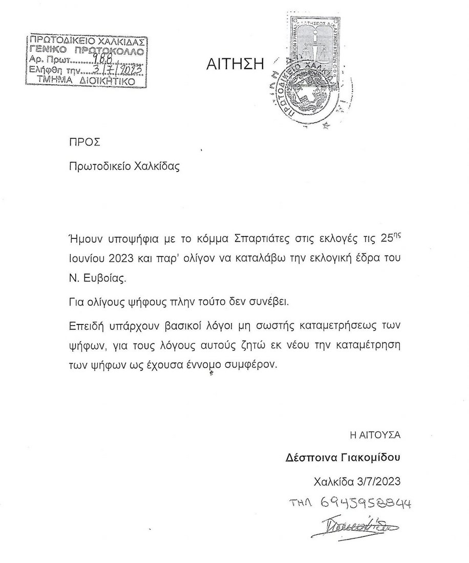 Ωστόσο η Δέσποινα Γιακομίδου δεν ... καταθέτει τα όπλα. Την Δευτέρα 3 Ιουλίου κατέθεσε αίτηση (φωτό κάτω) προς το Πρωτοδικείο Χαλκίδας για επανακαταμέτρηση όλων των ψήφων, που έλαβαν οι Σπαρτιάτες στην Εύβοια.