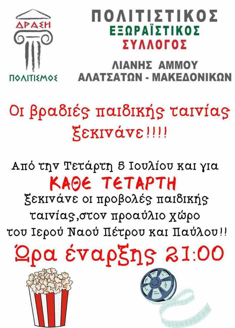 Οι βραδιές παιδικής ταινίας ξεκινούν στην γειτονιά της Λιανής Άμμου, με πρωτοβουλία του Πολιτιστικού και Εξωραϊστικού Συλλόγου Λιανής Άμμου - Αλατσάτων- Μακεδονικών.