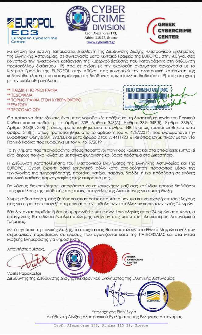 Μάλιστα, στην προσπάθειά τους να προσδώσουν «αληθοφάνεια» στη σχετική επιστολή χρησιμοποιούν τα λογότυπα της Ελληνικής Αστυνομίας και της Europol και εντύπωμα στρογγυλής σφραγίδας με δήθεν υπογραφή του Διευθυντή της Διεύθυνσης Δίωξης Ηλεκτρονικού Εγκλήματος.