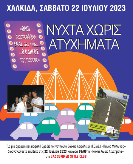 Το Ινστιτούτο Οδικής Ασφάλειας (Ι.Ο.ΑΣ.) «Πάνος Μυλωνάς», με παρουσία των στελεχών και των εθελοντών του, διοργανώνει για 15η συνεχόμενη χρονιά την εκδήλωση «Νύχτα χωρίς Ατυχήματα», το Σάββατο 22 Ιουλίου, στo κέντρο διασκέδασης Gaz στη Χαλκίδα.