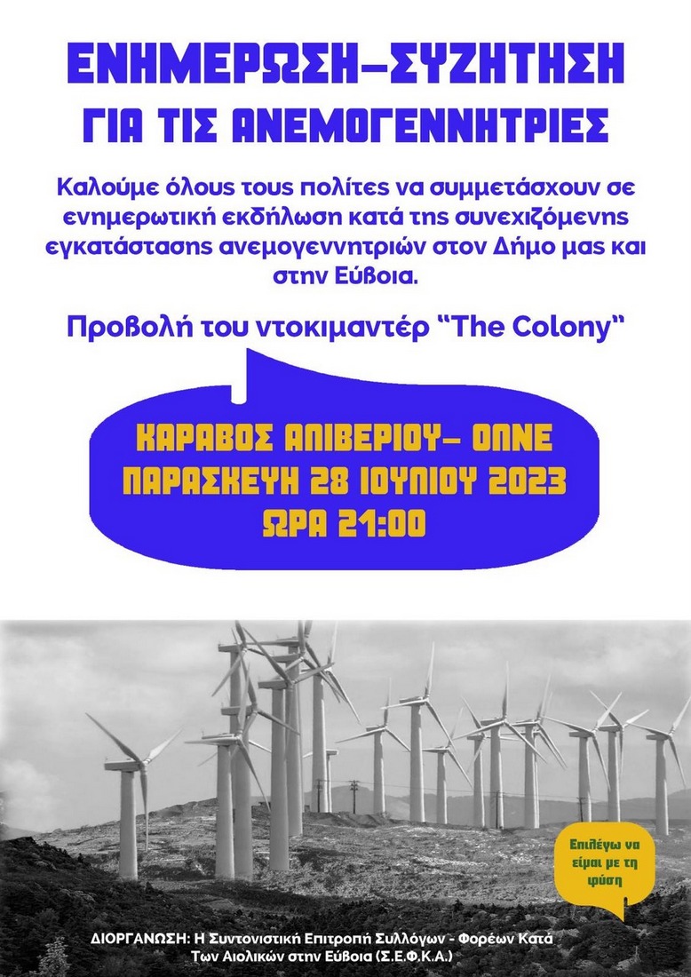 Η δράση αυτή γίνεται σε συνεργασία με την "Συντονιστική Επιτροπή Συλλόγων - Φορέων κατά των Αιολικών στην Εύβοια" και στη διάρκειά της θα προβληθεί το ντοκιμαντέρ "The Colony".