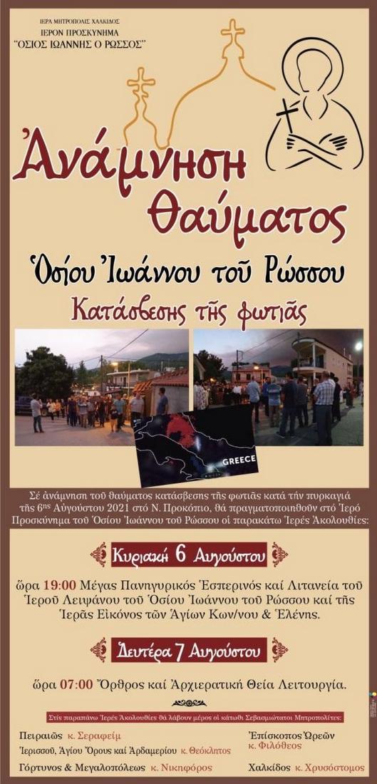 Στο Ιερό Προσκύνημα του Οσίου Ιωάννη του Ρώσσου στο Νέο Προκόπι της Εύβοιας, κατά το διήμερο 6 και 7 Αυγούστου, πρόκειται να τελεσθεί η δεύτερη ευχαριστήρια πανήγυρη, σε ανάμνηση του θαύματος της βροχοπτώσεως κατά τις πυρκαγιές του 2021.