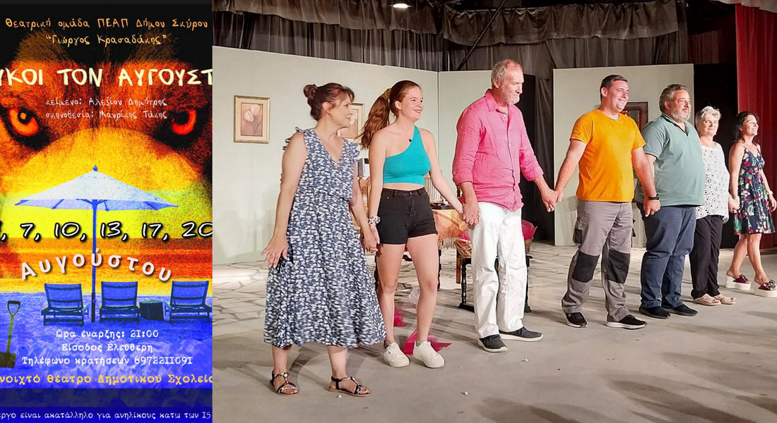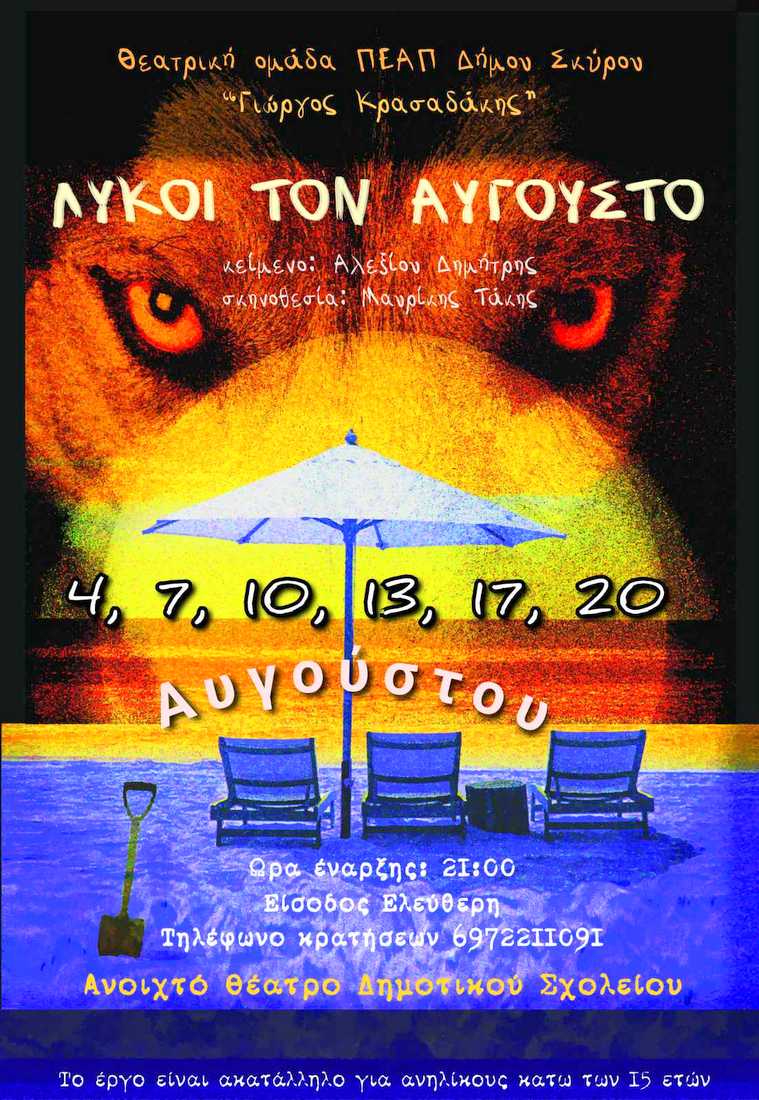 Μεγάλη επιτυχία σημειώνει στο ανοιχτό δημοτικό θέατρο Σκύρου, η μαύρη κωμωδία – θρίλερ «Λύκοι τον Αύγουστο», που ανεβαίνει σε πανελλήνια πρώτη και σε σκηνοθεσία Τάκη Μαυρίκη στη Σκύρο από τη θεατρική ομάδα ΠΕΑΠ Δήμου Σκύρου «Γιώργος Κρασαδάκης».