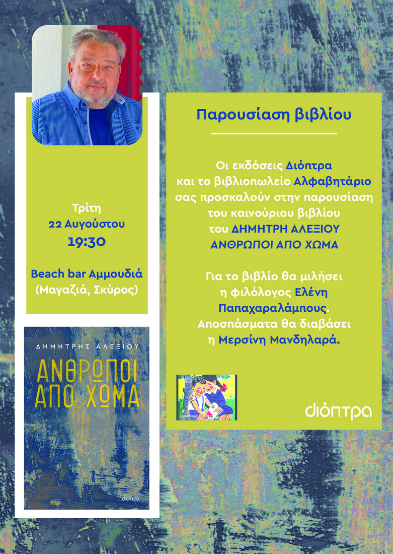 Ο Δημήτρης Αλεξίου , με καταγωγή από τη Σκύρο, έχει γράψει πέντε μυθιστορήματα, πέντε θεατρικά έργα και αρκετά διηγήματα. Έχει τιμηθεί με το βραβείο Eurodram 2022 για το θεατρικό του έργο «Το κουδούνι».
