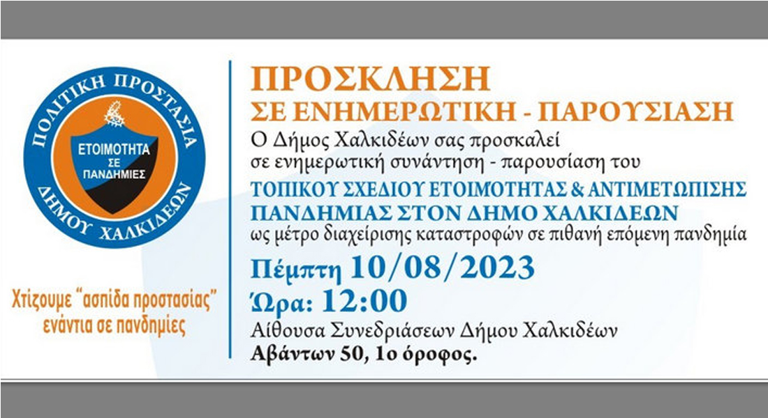 Ο Δήμος Χαλκιδέων διοργανώνει εκδήλωση για την Ενημερωτική Παρουσίαση του Τοπικού Σχεδίου Ετοιμότητας και Αντιμετώπισης Πανδημίας, ως μέτρο διαχείρισης καταστροφών σε πιθανή επόμενη πανδημία.