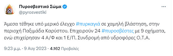 Ο Σύλλογος Εθελοντών Δασοπροστασίας Καρύστου με ανάρτησή του ενημέρωσε για άλλες δύο φωτιές, που εκδηλώθηκαν την Τετάρτη 9 Αυγούστου, τονίζοντας τα εξής: