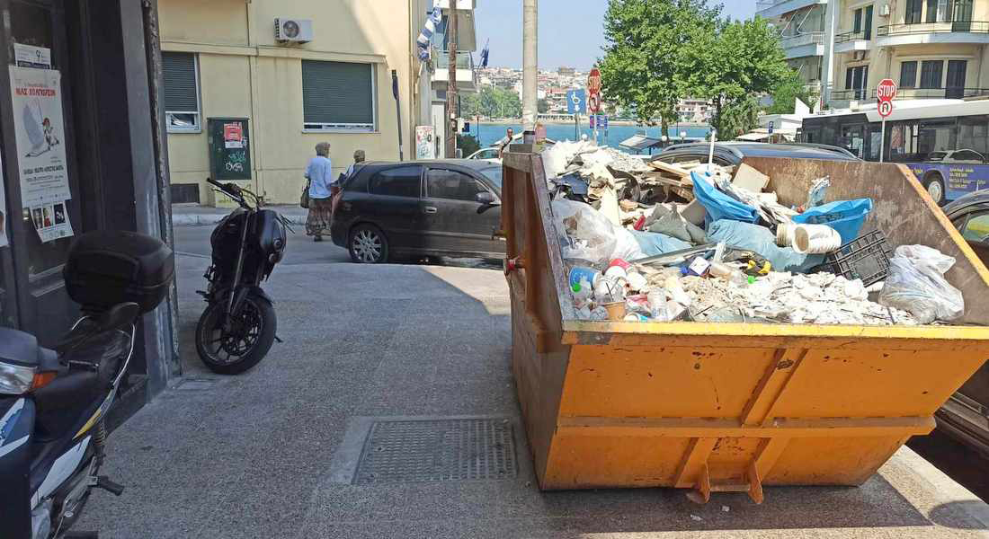 Η τέταρτη παράβαση είναι πολλαπλή. Ο κάδος για τα μπάζα της οικοδομής, του υπό ανακαίνιση καταστήματος είναι πάνω στο πεζοδρόμιο, ενώ θα έπρεπε να είναι στο δρόμο και επιπλέον έχει μετατραπεί σε κάδο απορριμμάτων.