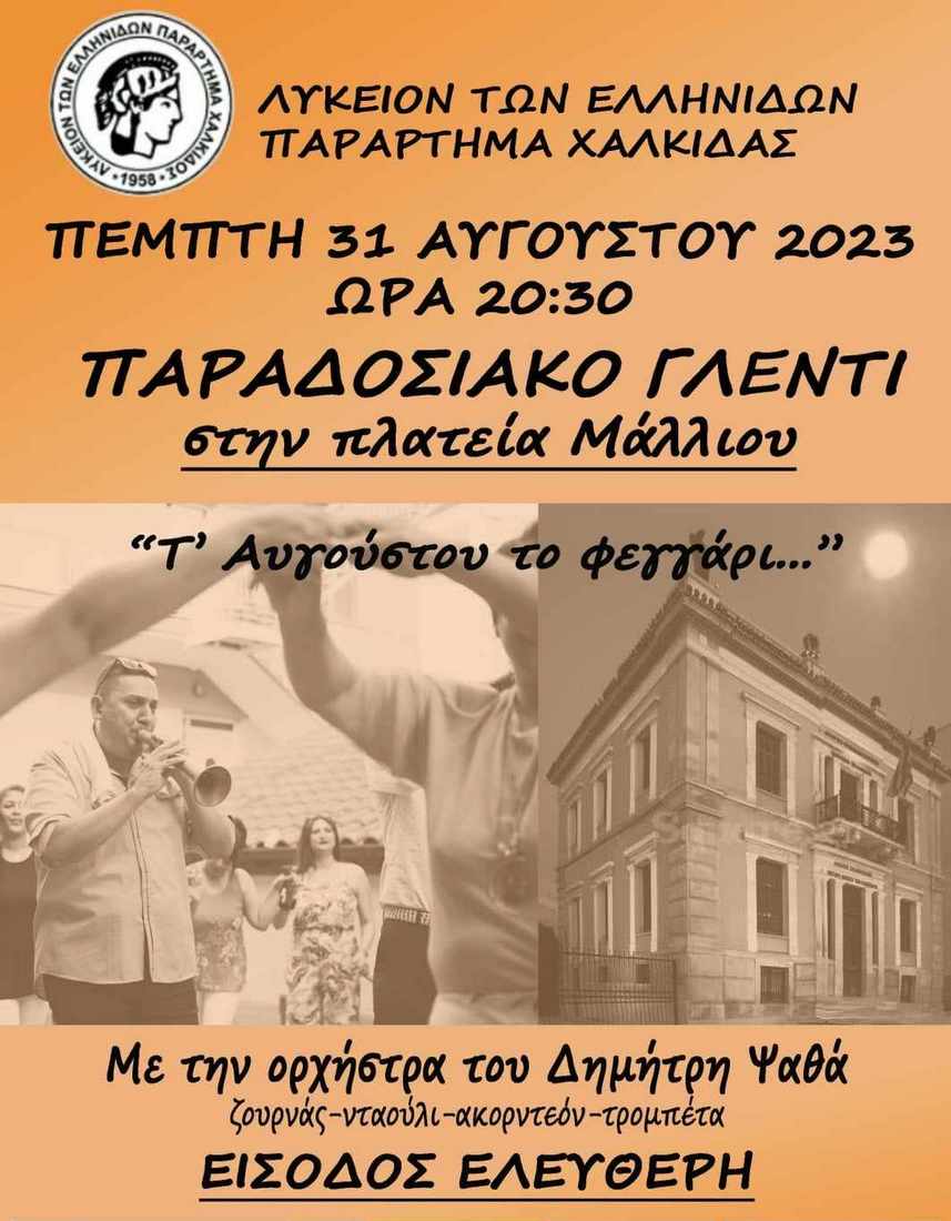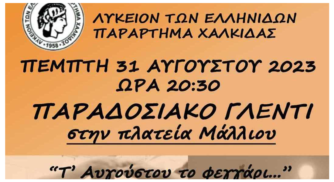 Η Εφορεία Εθνικών Χορών του Λυκείου των Ελληνίδων- Παράρτημα Χαλκίδας, θέλοντας να αποχαιρετίσει το καλοκαίρι και ταυτόχρονα να υποδεχτεί τη νέα Λυκειακή χρονιά, διοργανώνει παραδοσιακό γλέντι υπό το φως της τελευταίας πανσελήνου του καλοκαιριού.