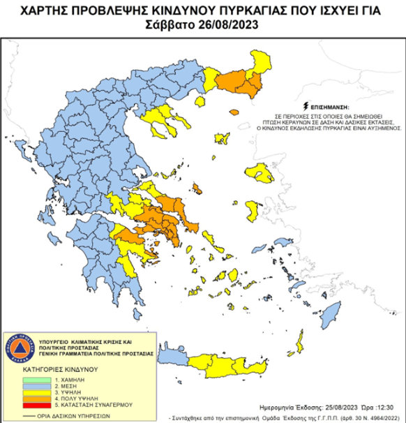 Σύμφωνα με τον Χάρτη Πρόβλεψης Κινδύνου Πυρκαγιάς που εκδίδει η Γενική Γραμματεία Πολιτικής Προστασίας για αύριο Σάββατο 26 Αυγούστου 2023, προβλέπεται πολύ υψηλός κίνδυνος πυρκαγιάς (κατηγορία κινδύνου 4) στο μεγαλύτερο τμήμα της Εύβοιας και την Σκύρο (δείτε τον χάρτη κάτω).