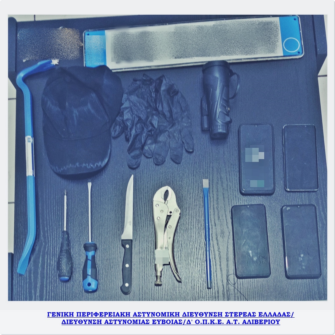 Εντός του προαναφερόμενου οχήματος που κατασχέθηκε, βρέθηκαν οι πινακίδες κυκλοφορίας του, ένα μαχαίρι, δύο λοστοί μήκους 50 και 25 εκατοστών αντίστοιχα, ένα κιάλι – διόπτρα, τέσσερα κινητά τηλέφωνα, δύο κατσαβίδια και άλλα διαρρηκτικά εργαλεία.