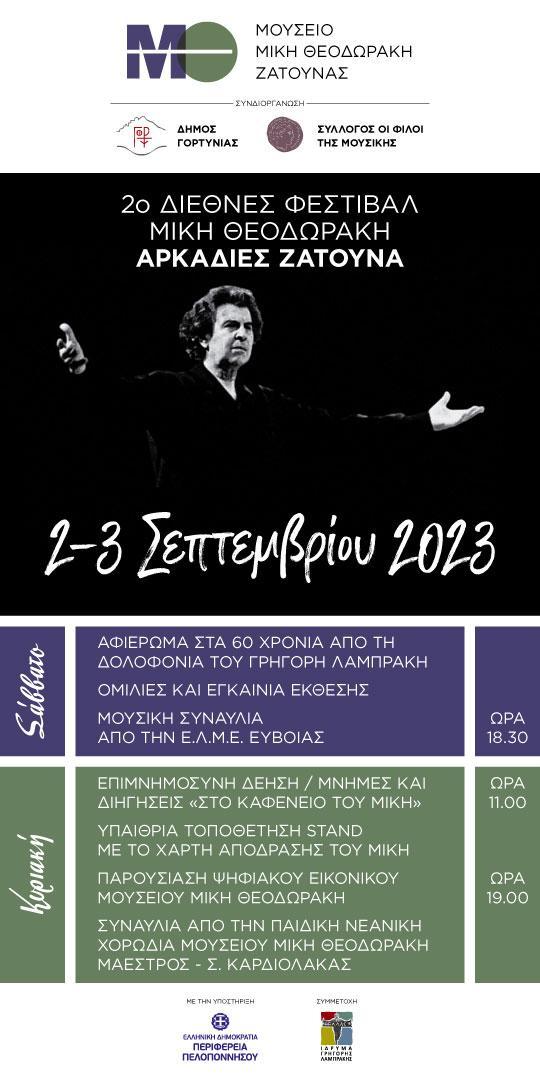 Η Πολιτιστική Ομάδα της ΕΛΜΕ Εύβοιας θα λάβει μέρος 2ο Διεθνές Φεστιβάλ Μίκη Θεοδωράκη Αρκαδίες – Ζάτουνα, το διήμερο 2-3 Σεπτεμβρίου, παρουσιάζοντας μουσικό αφιέρωμα στον κορυφαίο συνθέτη, με τίτλο "την πόρτα ανοίγω το βράδυ".