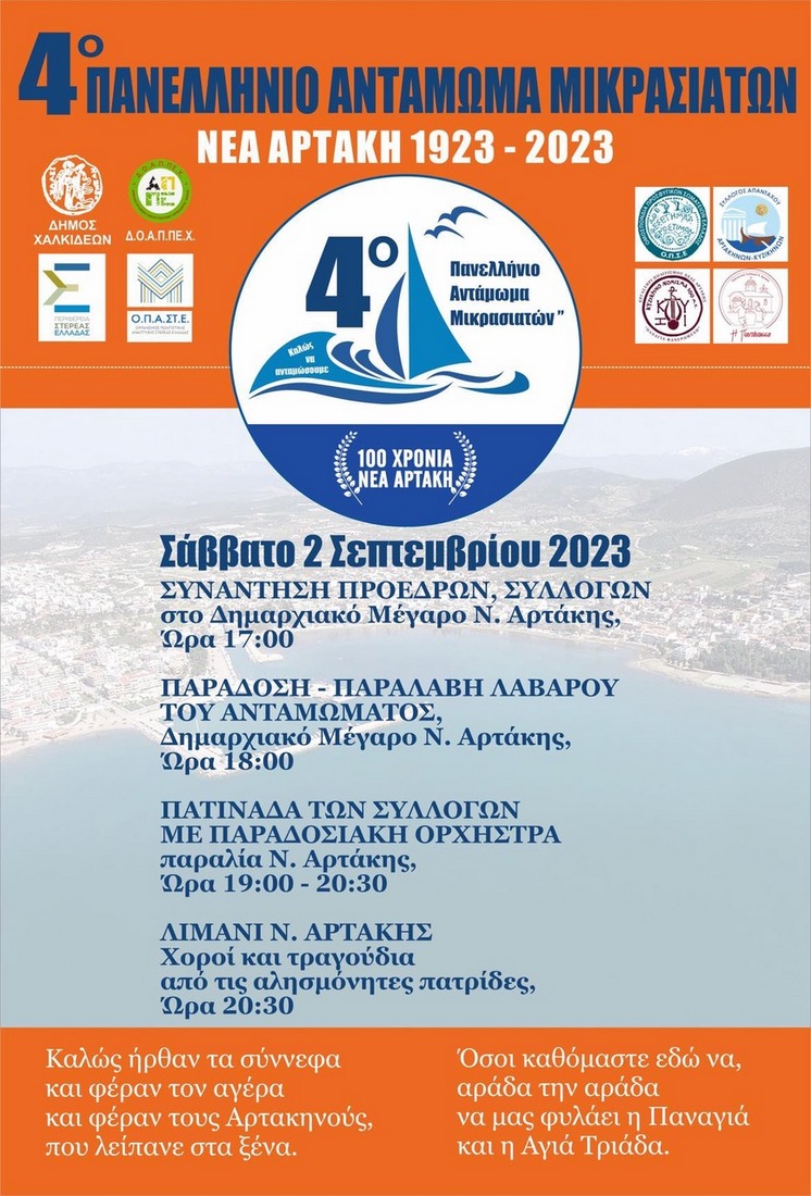 Το Σάββατο 2 Σεπτεμβρίου, στις 8:30 το βράδυ, θα πραγματοποιηθεί στο λιμάνι της Αρτάκης το 4ο πανελλήνιο αντάμωμα Μικρασιατών, που περιλαμβάνει χορούς και τραγούδια από τις αλησμόνητες πατρίδες, στο λιμάνι της Αρτάκης.