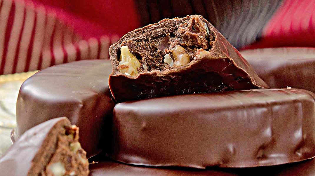 Έπειτα, αφαιρούμε τη μεμβράνη, κόβουμε σε φέτες πάχους 1 εκατ. και μία-μία βουτάμε τις καριόκες στην κουβερτούρα, την οποία έχουμε λιώσει σε μπεν μαρί.