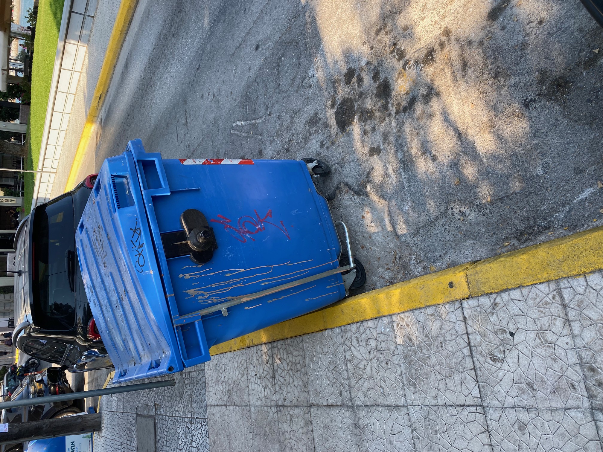 Πρόκειται για το οδόστρωμα επί της οδού Φαρμακίδου μπροστά από τις εγκαταστάσεις βιολογικού καθαρισμού του δήμου. Εκεί, λοιπόν, βρίσκεται ο μπλε κάδος απορριμμάτων που βλέπετε και ο οποίος συχνά πυκνά μετακινείται δεξιά-αριστερά.