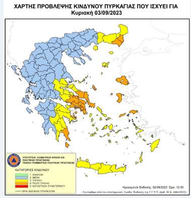 Σύμφωνα με τον Χάρτη Πρόβλεψης Κινδύνου Πυρκαγιάς που εκδίδει η Γενική Γραμματεία Πολιτικής Προστασίας για την Κυριακή 3 Σεπτεμβρίου, προβλέπεται πολύ υψηλός κίνδυνος πυρκαγιάς (κατηγορία κινδύνου 4) για το μεγαλύτερο τμήμα της Εύβοιας και της Σκύρου (δείτε τον χάρτη κάτω)