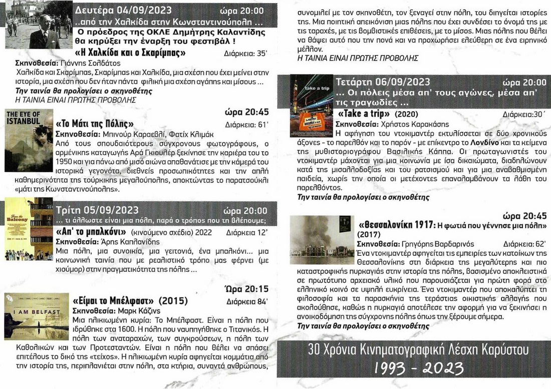Στις «Πόλεις» είναι αφιερωμένο το 6ο φεστιβάλ ντοκιμαντέρ που διοργανώνει η Κινηματογραφική Λέσχη Καρύστου, σε συνεργασία με τον θερινό κινηματογράφο «Αύρα» και τον πολιτιστικό οργανισμό του Δήμου Καρύστου «Ανεμοπύλες» στις 4, 5 και 6 Σεπτεμβρίου 2023.