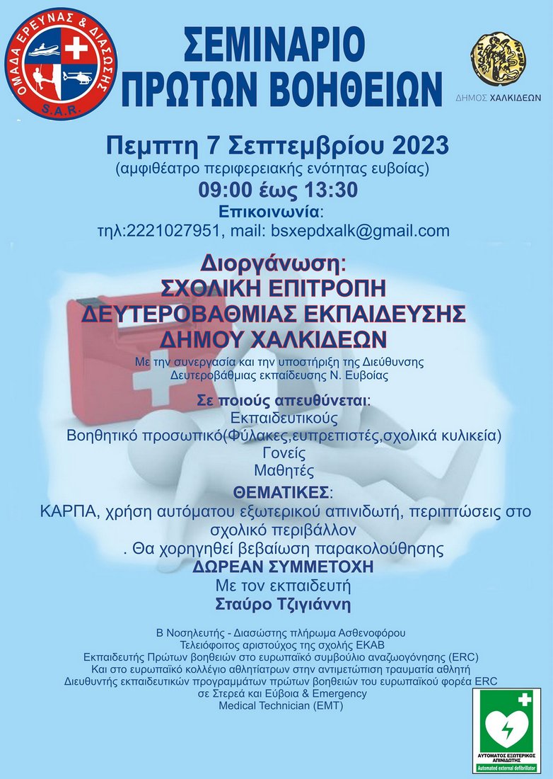 Σεμινάριο Πρώτων Βοηθειών, ΚΑΡΠΑ και χρήση αυτόματου εξωτερικού απινιδωτή, για περιπτώσεις στο σχολικό περιβάλλον, διοργανώνει ο Δήμος Χαλκιδέων, μέσω της Σχολικής Επιτροπής Δευτεροβάθμιας Εκπαίδευσης Δήμου Χαλκιδέων, σε συνεργασία με την Ομάδα Έρευνας και Διάσωσης και με την υποστήριξη της Διεύθυνσης Δευτεροβάθμιας Εκπαίδευσης Εύβοιας.