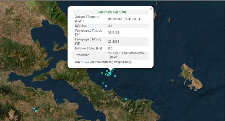Το επίκεντρο βρίσκεται σε απόσταση 22 χιλιομέτρων βορειοανατολικά του Μαντουδίου, ενώ το εστιακό βάθος είναι στα 8 χιλιόμετρα. Δείτε κάτω και τον χάρτη του Γεωδυναμικού Ινστιτούτου.