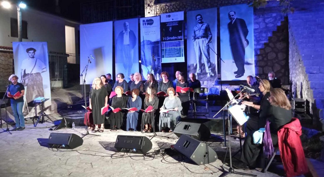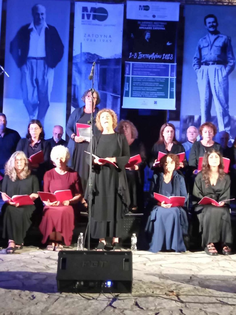 Σε έναν εμβληματικό χώρο, έξω από το πρώην Δημοτικό σχολείο Ζάτουνας, που από το 2006 λειτουργεί ως Μουσείο Μίκης Θεοδωράκης και με έντονο το βάρος της ιστορικής μνήμης, παρουσίασε η Πολιτιστική Ομάδα της ΕΛΜΕ Εύβοιας το μουσικοθεατρικό της αφιέρωμα στον μεγάλο συνθέτη.