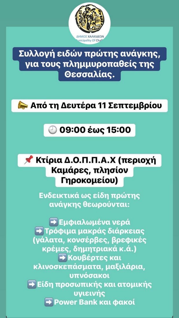 Ο Δήμος Χαλκιδέων προχωράει στη συγκέντρωση ειδών πρώτης ανάγκης για τους πλημμυροπαθείς της Θεσσαλίας, από την Δευτέρα 11 Σεπτεμβρίου, από τις 9 το πρωί μέχρι τις 3 το μεσημέρι.