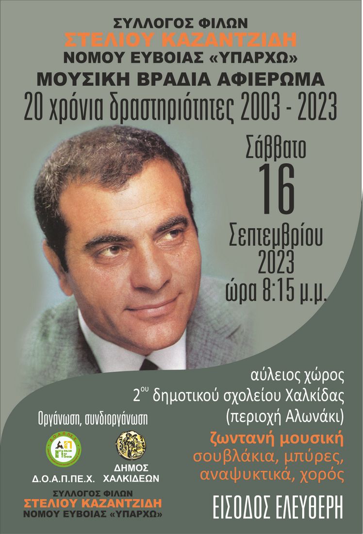 Ο Σύλλογος Φίλων Στέλιου Καζαντζίδη νομού Ευβοίας γιορτάζει τα 20 χρόνια λειτουργίας του, το Σάββατο 16 Σεπτεμβρίου, στις 8:30 το βράδυ, στο 2ο Δημοτικό Σχολείο Χαλκίδας.