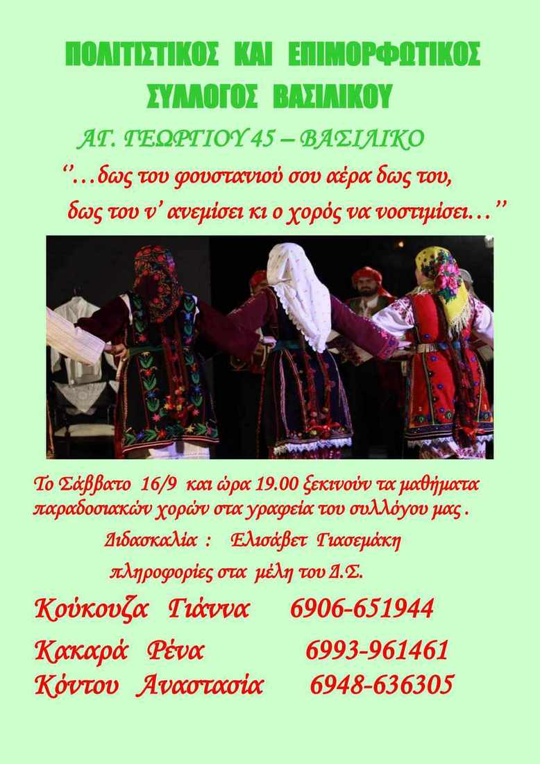 Από τον Πολιτιστικό και Επιμορφωτικό Βασιλικού ανακοινώθηκε ότι το Σάββατο 16 Σεπτεμβρίου ξεκινούν τα μαθήματα παραδοσιακών χορών στα γραφεία του Συλλόγου.