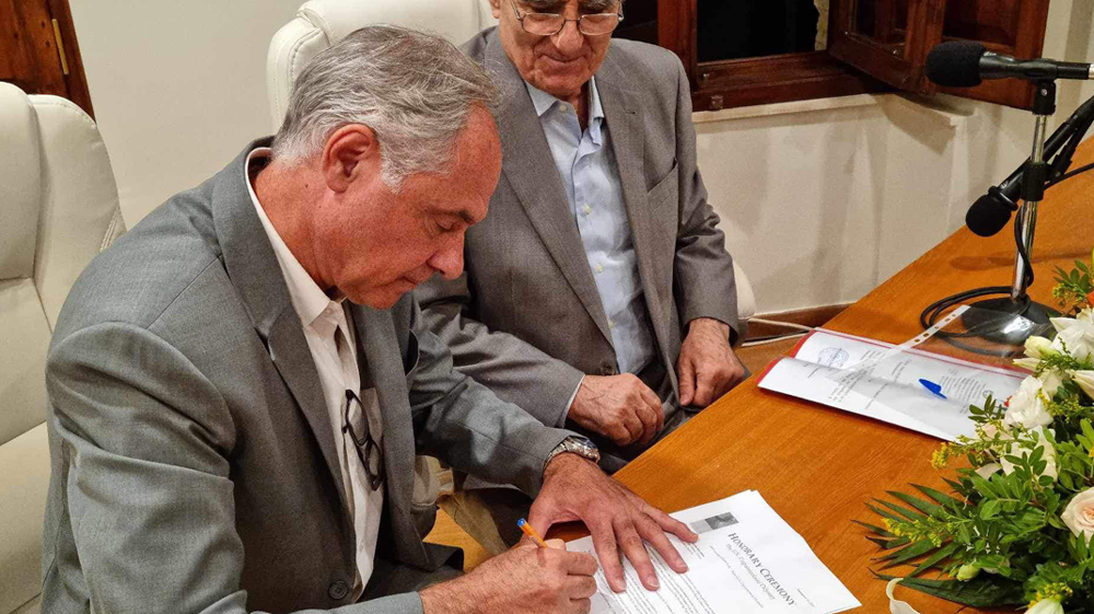 Μάλιστα, υπέγραψε και το σχετικό έγγραφο με τον δήμαρχο Θανάση Μπουραντά, ενώ απηύθυνε και σύντομο χαιρετισμό (δείτε το βίντεο).