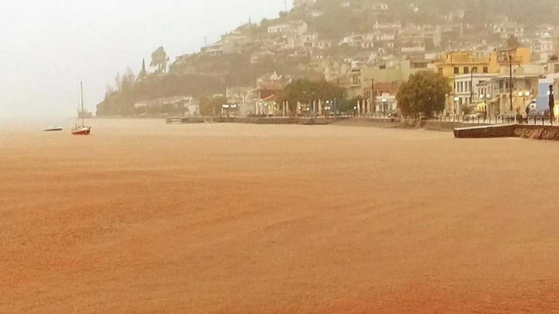 Στη Λίμνη πλημμύρισαν δρόμοι και τόνοι λάσπης που μεταφέρθηκαν από το βουνό έπεσαν στη θάλασσα (φωτό κάτω) αλλάζοντας το χρώμα της (δείτε εδώ)