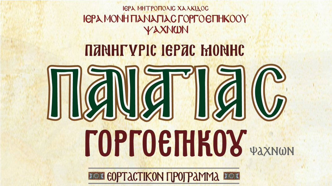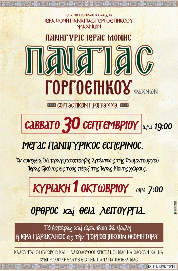 Η ιερά Μονή Παναγίας Γοργοεπηκόοου Ψαχνών πανηγυρίζει το διήμερο 30 Σεπτεμβρίου- 1 Οκτωβρίου, σύμφωνα με το παρακάτω πρόγραμμα: