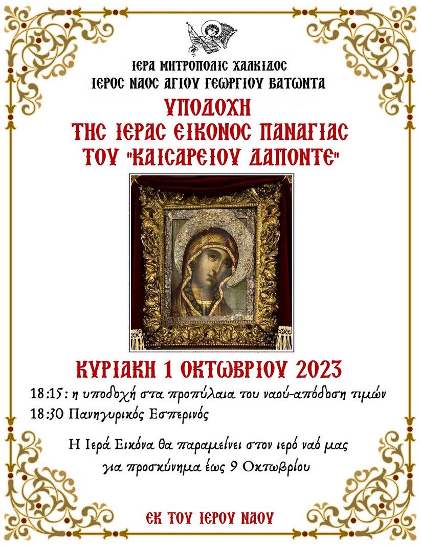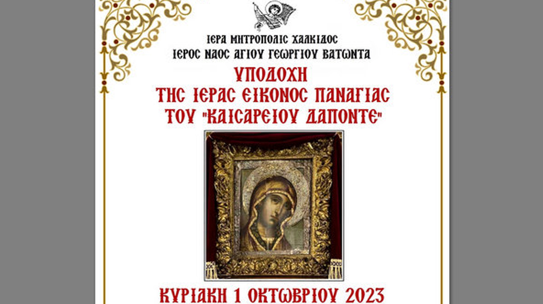 Την θαυματουργή ιερή εικόνα της Παναγίας του Δαπόντε, από την Ιερή Μονή Ευαγγελισμού της Θεοτόκου Σκοπέλου, θα υποδεχτεί ο ιερός ναός Αγίου Γεωργίου Βατώντα, την Κυριακή 1 Οκτωβρίου.