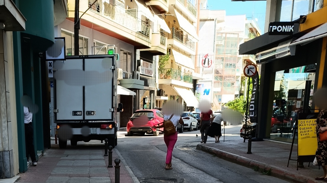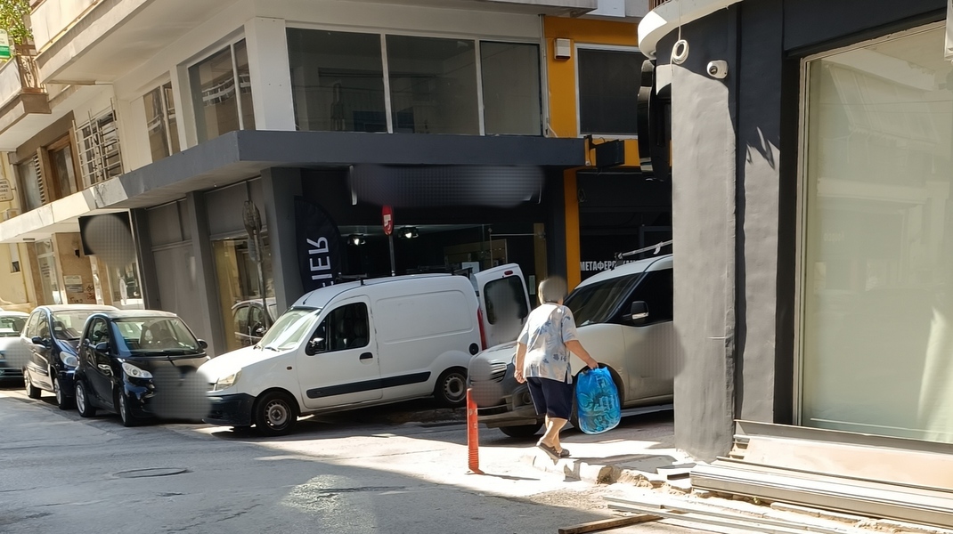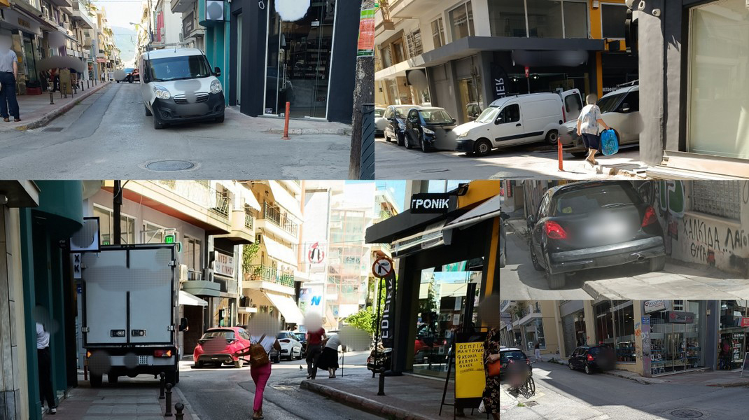 Όπως βλέπετε, φορτηγά, ημιφορτηγά και ΙΧ αυτοκίνητα καταλαμβάνουν όλο το πεζοδρόμιο, μην αφήνοντας περιθώριο στους πεζούς να περπατήσουν πάνω σ' αυτό, όπως προβλέπεται.