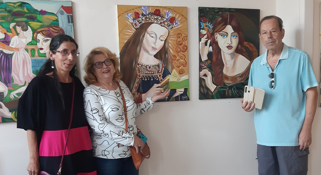 Στην φωτογραφία η ζωγράφος (αριστερά) με επισκέπτες της έκθεσής της.