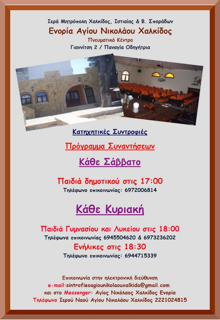 Από την Ενορία Αγίου Νικολάου Χαλκίδας ανακοινώθηκε το πρόγραμμα των συναντήσεων στις Κατηχητικές Συντροφιές , που θα πραγματοποιούνται στο Πνευματικό Κέντρο της Ενορίας, στο προαύλιο του ιερού παρεκκλησίου της Μέσα Παναγίτσας, στην οδό Γιαννίτση 2, ως εξής: