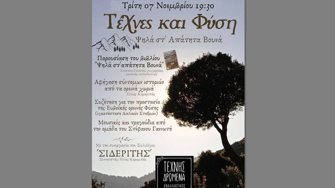 Ο Σύλλογος "Σιδερίτης" θα πραγματοποιήσει την Τρίτη 7 Νοεμβρίου, στις 7 το απόγευμα, εκδήλωση στον καλλιτεχνικό χώρο "Τέχνης δρώμενα" στην Χαλκίδα με θέμα " Ψηλά στ' απάτητα βουνά ", στο πλαίσιο των γενικότερων εκδηλώσεων με τίτλο "Τέχνες και Φύση".