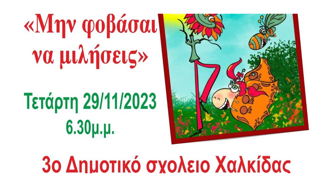 Το Δ.Σ. του Συλλόγου Δασκάλων και Νηπιαγωγών Χαλκίδας ,την Τετάρτη 29 Νοεμβρίου, στις 6:30 το απόγευμα, στην αίθουσα εκδηλώσεων του 3ου Δημοτικού Σχολείου Χαλκίδας , παρουσιάζει το παιδικό παραμύθι της Χρύστας Δημαρέλου, με τίτλο «Μην φοβάσαι να μιλήσεις» .